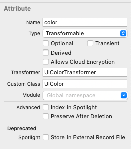 ValueTransformer.setValueTransformer(UIColorTransformer(), forName: NSValueTransformerName("UIColorTransformer"))