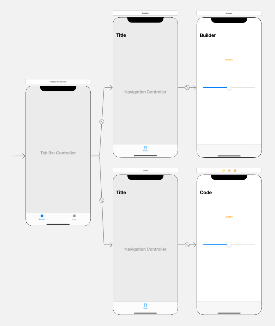 Tab Bar Controller와 View Controller의 조합으로 서로 Relationship segue로 뷰들을 연결했다.