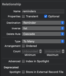 MyList는 Reminder로 연결되고, 여러개를 소유할 수 있으므로 To Many를 사용한다. inverse는 list 이다.
