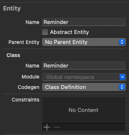 특별히 유별난 데이터를 저장할 것이 아니기때문에 Codegen도 Class Definition 그대로 둔다.