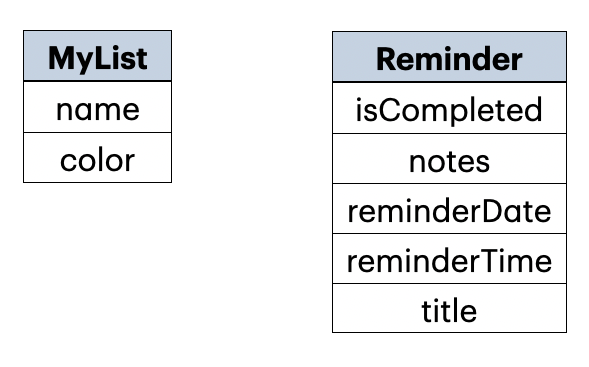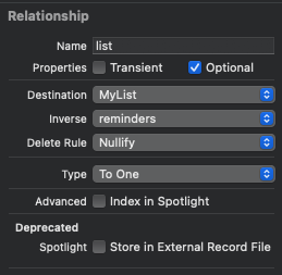 Reminder는 MyList로 연결되고, 하나를 소유해야 한다. To One을 사용한다. inverse는 reminders 이다.