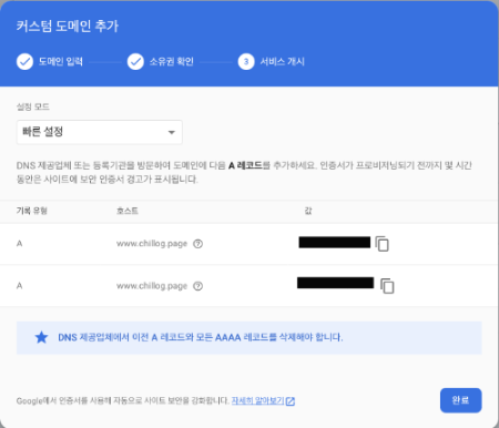 다른 곳에서 구입한 도메인을 입력했을 때(좌)와 google domain에서 구입한 도메인을 입력 했을 때(우)의 차이다.