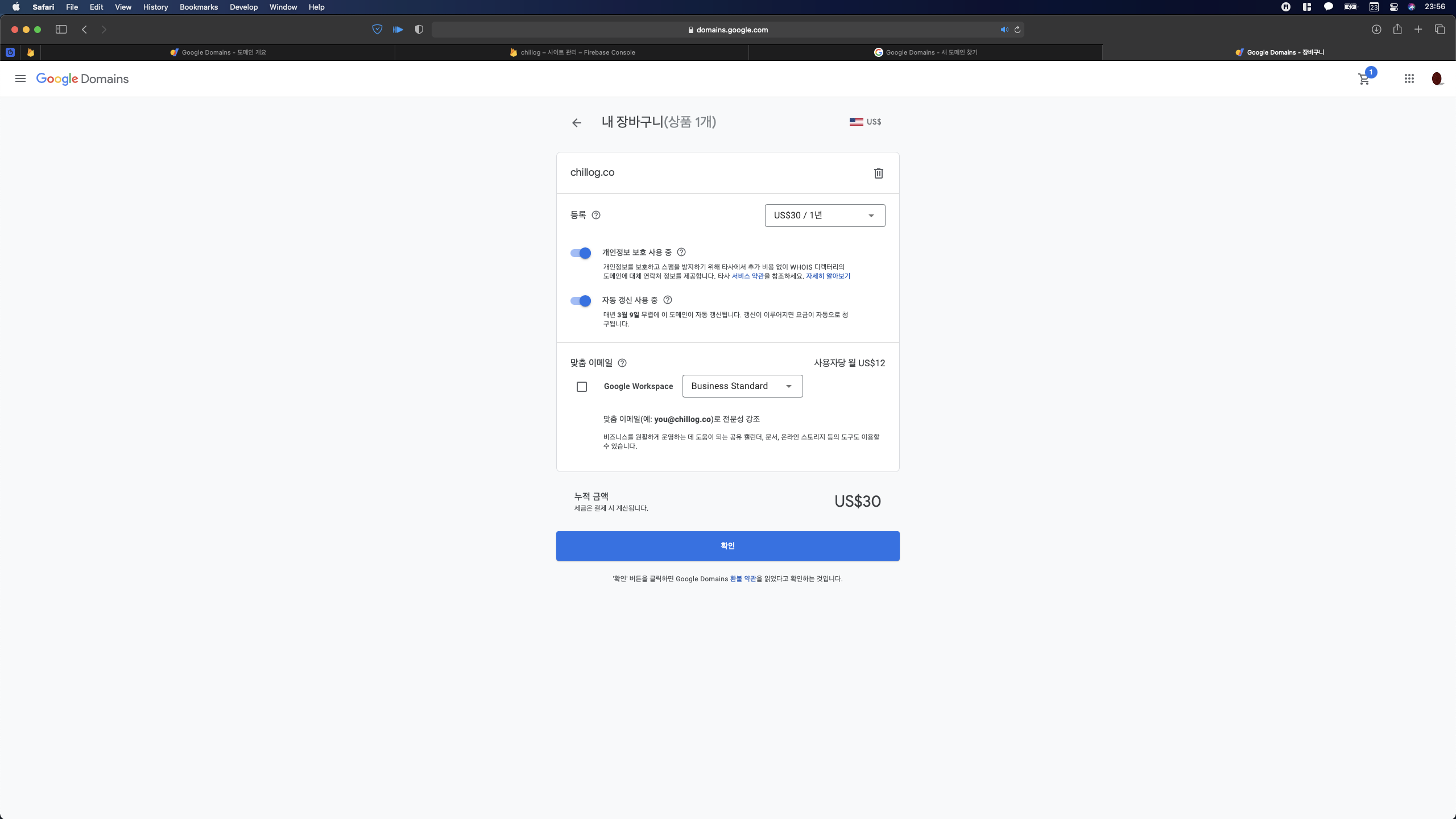 개인정보 보호와 구글 도메인의 최대 장점인 자동 갱신을 체크하고 확인을 클릭한다.