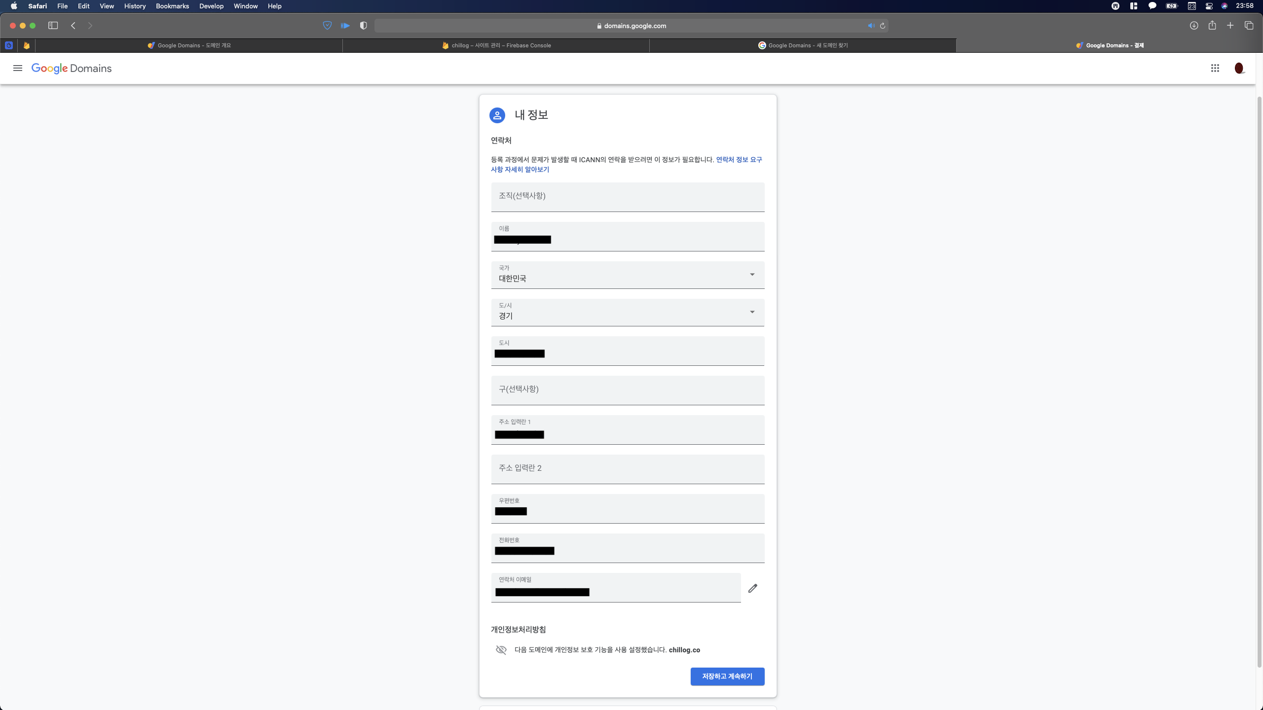 혹시 모르니 연락처도 영문으로 적어주고 '저장하고 계속하기' 클릭