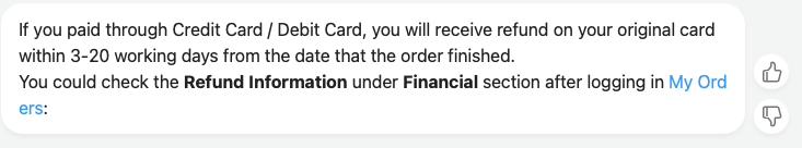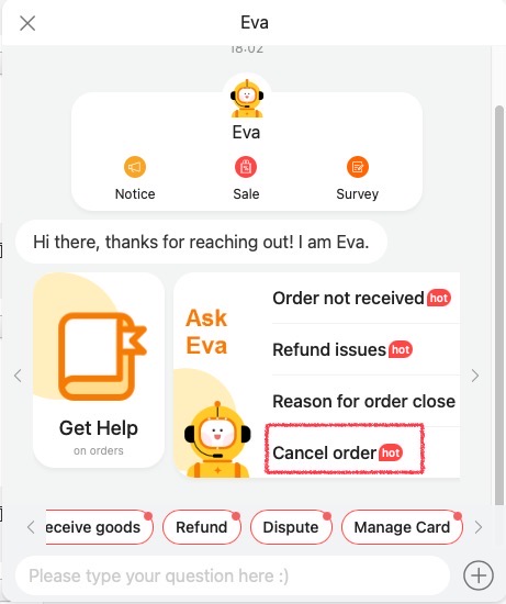 - Pay Success 상태에 'Cancel order' 버튼이 보이지 않을 경우 Eva의 메크로 답변에 '싫어요' 피드백으로 실제 상담사를 통한 취소가 가능하다.