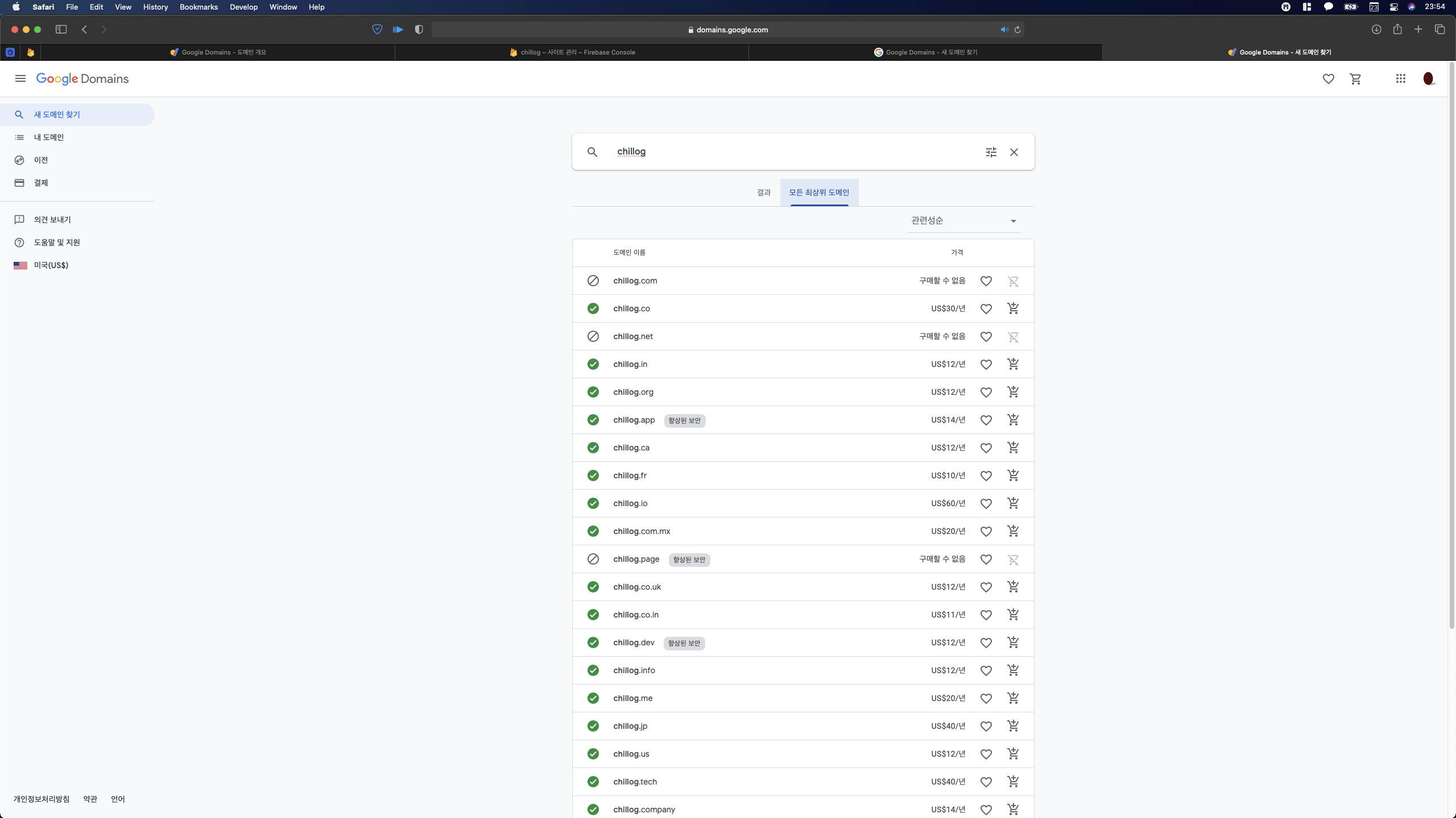 내 블로그 이름인 chillog로 검색을 하였고, 가장 익숙한 '.com'와 '.net'은 누군가가 이미 사용하는 듯하다.