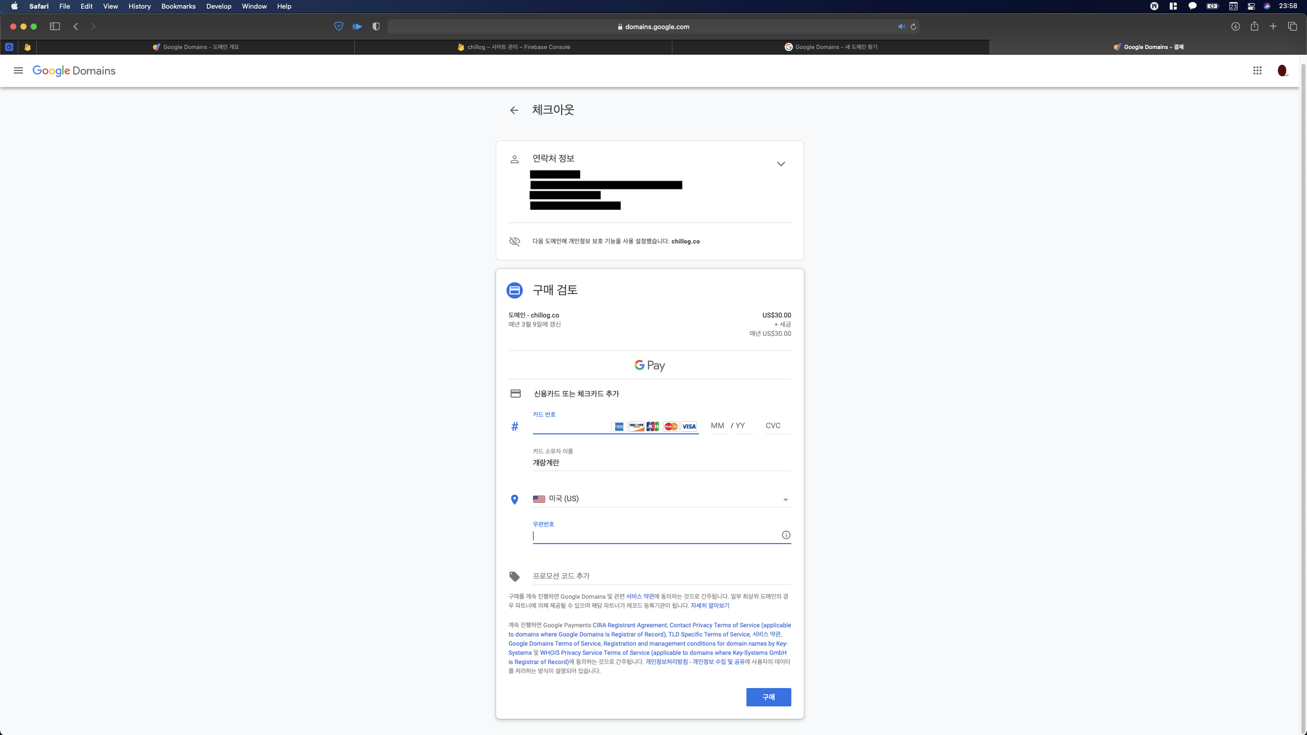 개인정보 보호와 구글 도메인의 최대 장점인 자동 갱신을 체크하고 확인을 클릭한다.