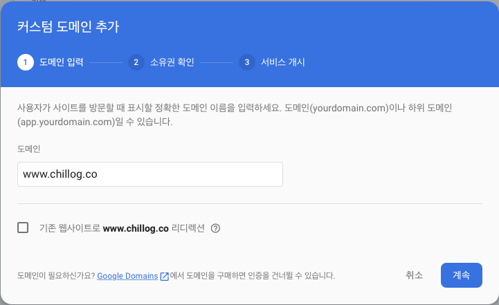 처음엔 'www.' 없이 구입한 도메인 그대로(chillog.co) 입력해 준다.