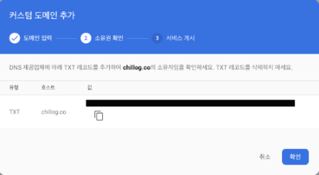 'firebase console > hosting > 커스텀 도메인 추가'를 누르면 팝업이 하나 등장하는데,