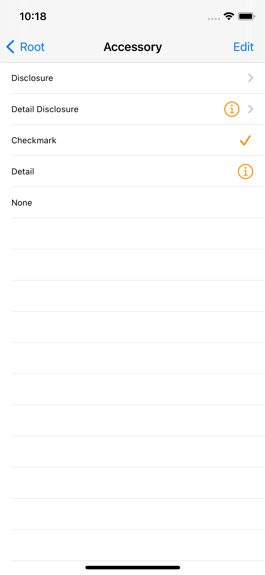Editing Acc. 옵션으로 위와 같은 항목을 제공하지만 여기서 설정한 AccessoryView는 편집 모드에서 표시된다.