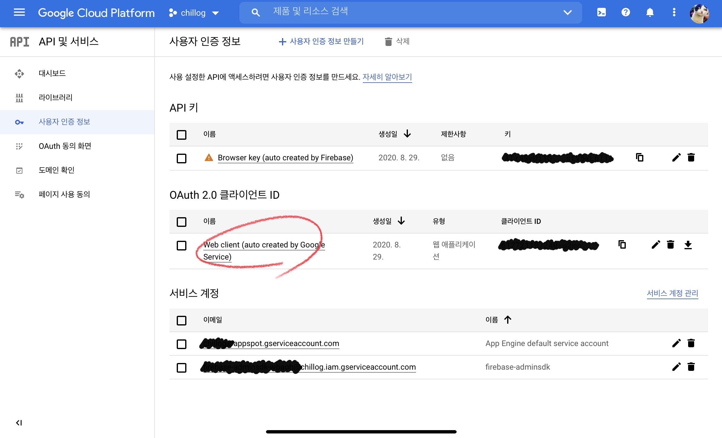 'GCP console > API 및 서비스 > 사용자 인증 정보'로 이동해서 OAuth 2.0 클라이언트 아이디를 클릭해 추가 설정으로 진입한다.