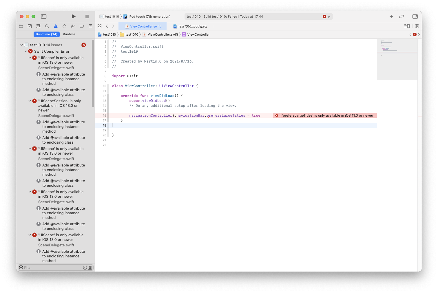 빌드 타겟을 10.0으로 설정하면 해당 코드를 비롯, 자동으로 작성됐던 코드들 까지 상당수가 에러를 표시한다.