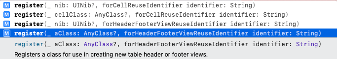 Header를 등록할 때는 Cell을 등록할 때와 비슷하게 register(forHeaderFooterViewReuseIndentifier:) 메소드를 사용한다.