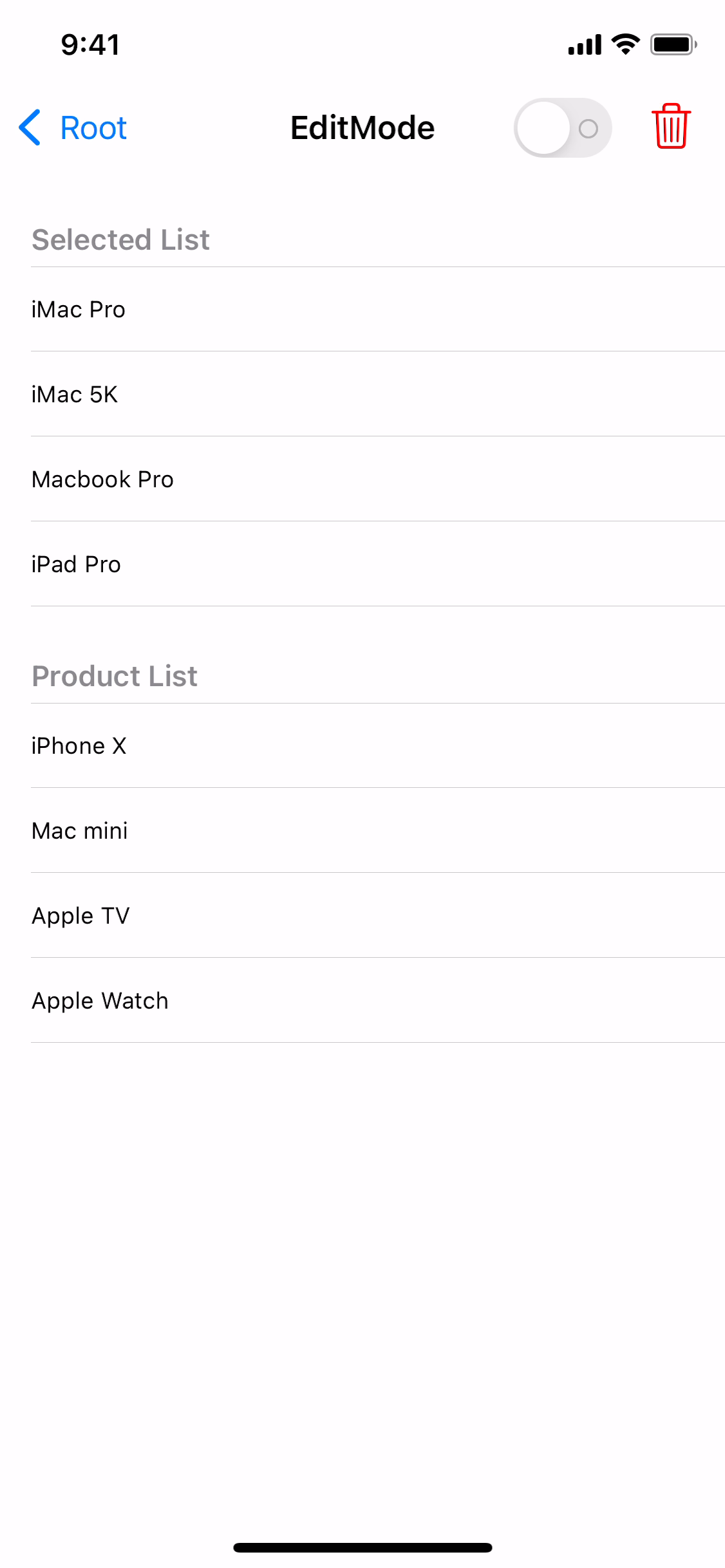 Selected List에는 제거 버튼을 표시해 삭제 후 Product List section으로 항목을 옮기고,