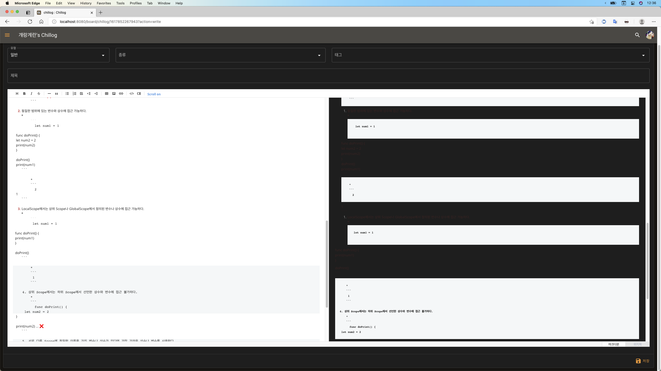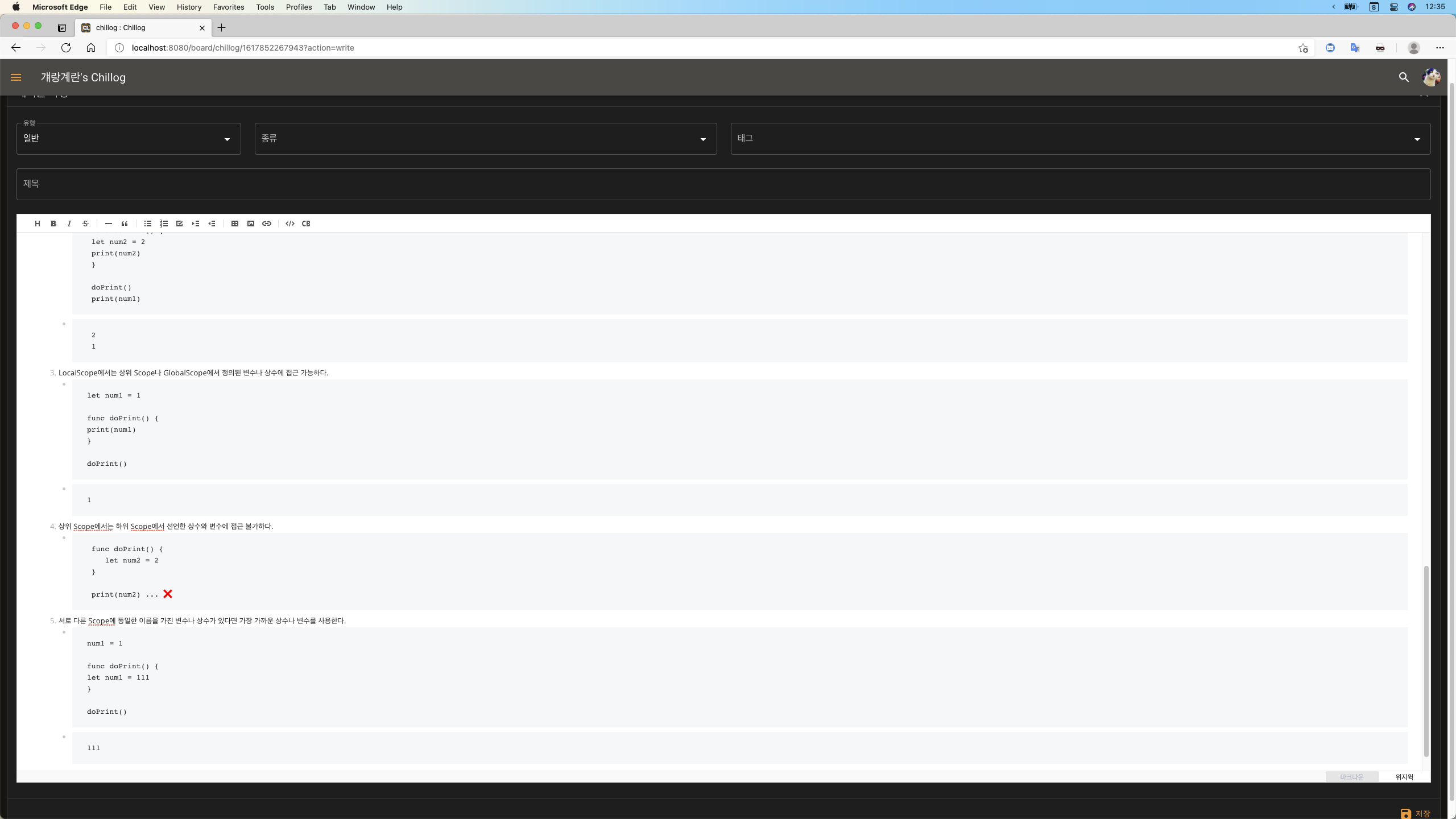 바로 직전의 swift 학습 정리 글이 그러하며, PC환경에서 글을 작성하는 경우 장문이 되거나 글이 복잡해 지는 경우가 있어