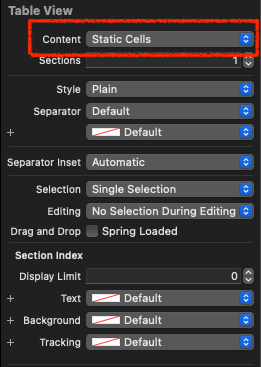 TableView의 attribute Inspector에서 Content 항목을 Static Cells로 바꾸는 걸로 간단하게 전환할 수 있다.