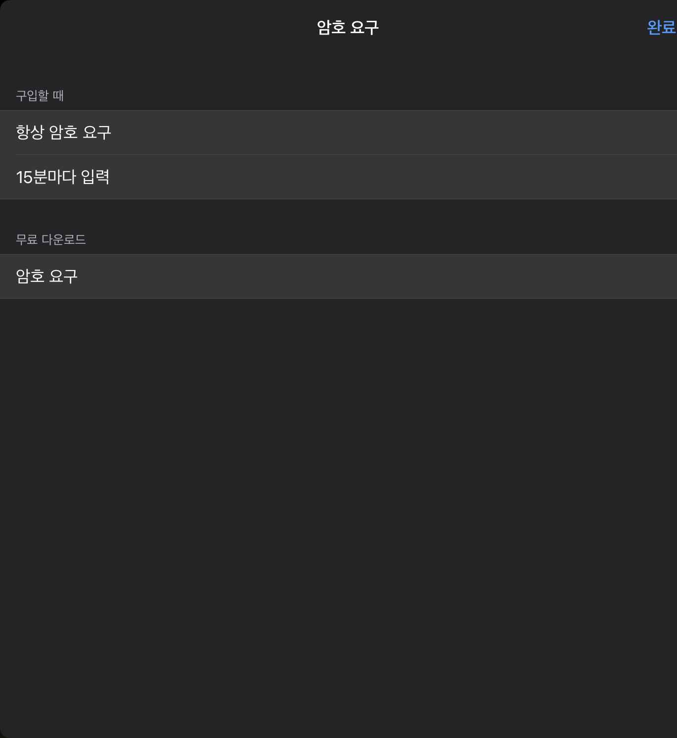 해당 설정에서 결제시엔 항상 요구하도록 하고, 무료 앱을 다운로드하는 경우엔 이를 건너뛸 수 있도록 설정이 가능한데
