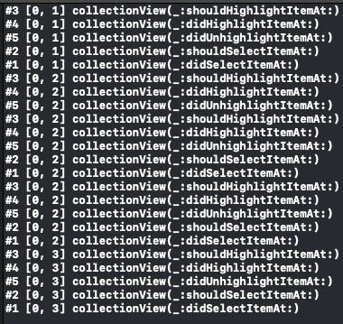 선택 이벤트는 Delegate 패턴으로 처리하며, 관련 메소드는 UICollectionViewDelegate 프로토콜에 선언되어있다.