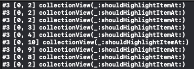 collectionView(shouldHighlightItemAt:) 메소드는 셀이 HIghlight 상태로 변하기 직전에 호출된다.