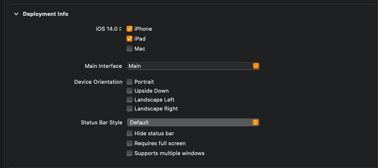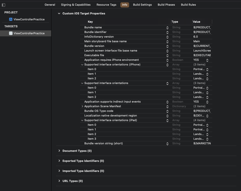 설정에서 선택한 값들은 Supported interface Orientations와 Supported interface Orientations(iPhone)에 저장된다.