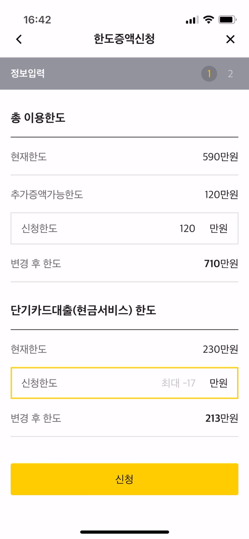 내가 선택해서 진입한 메뉴는 '한도 증액 신청'이고, 한도를 올리는 화면이다.