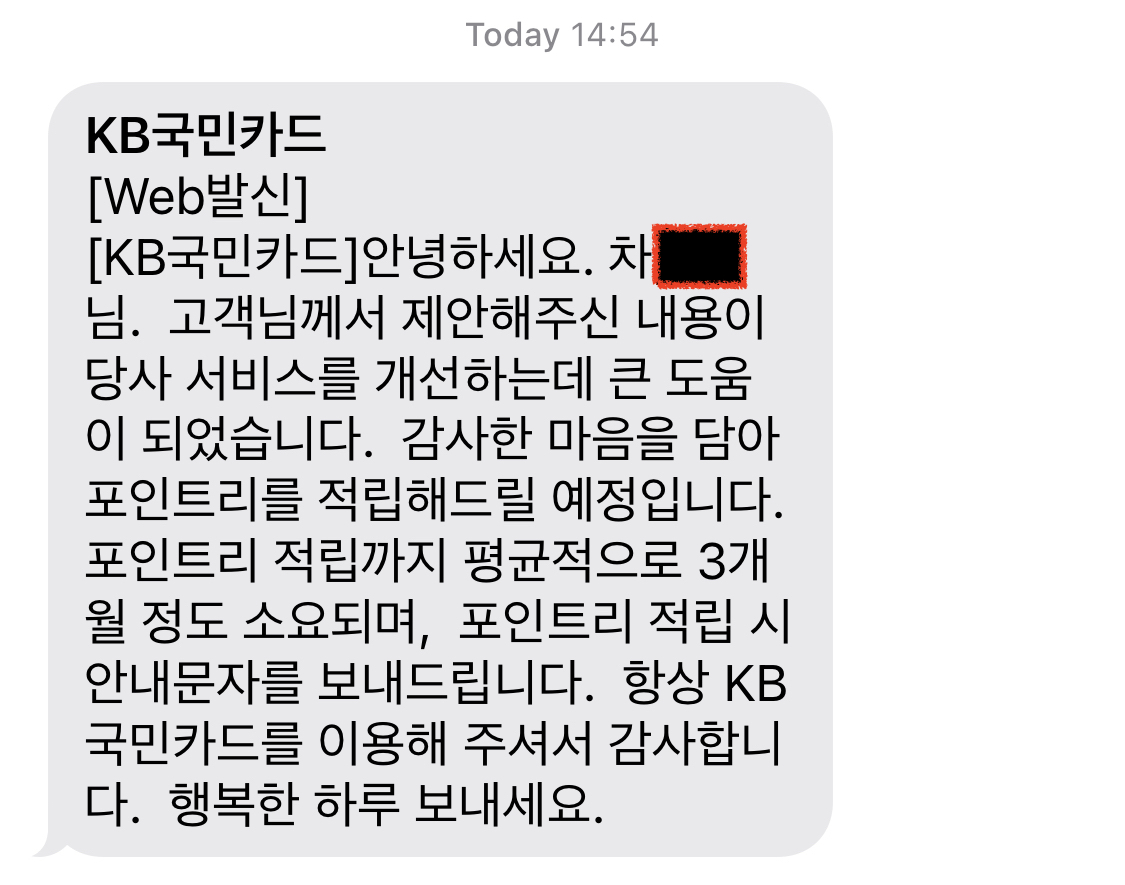 같은 내용을 국민카드 앱 고객제안 창구로 저번 주에 문의를 넣어둔 상태이다.