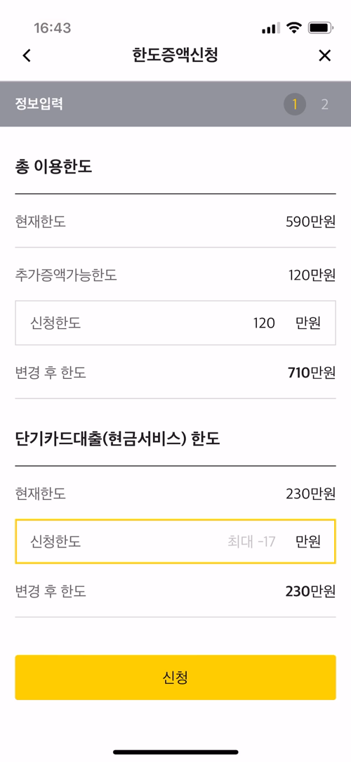 단기 카드대출한도의 Placeholder가 이에 맞지 않는 '-17'만원으로 표시되어있다.