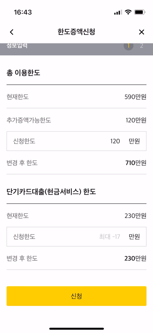 내가 선택해서 진입한 메뉴는 '한도 증액 신청'이고, 한도를 올리는 화면이다.