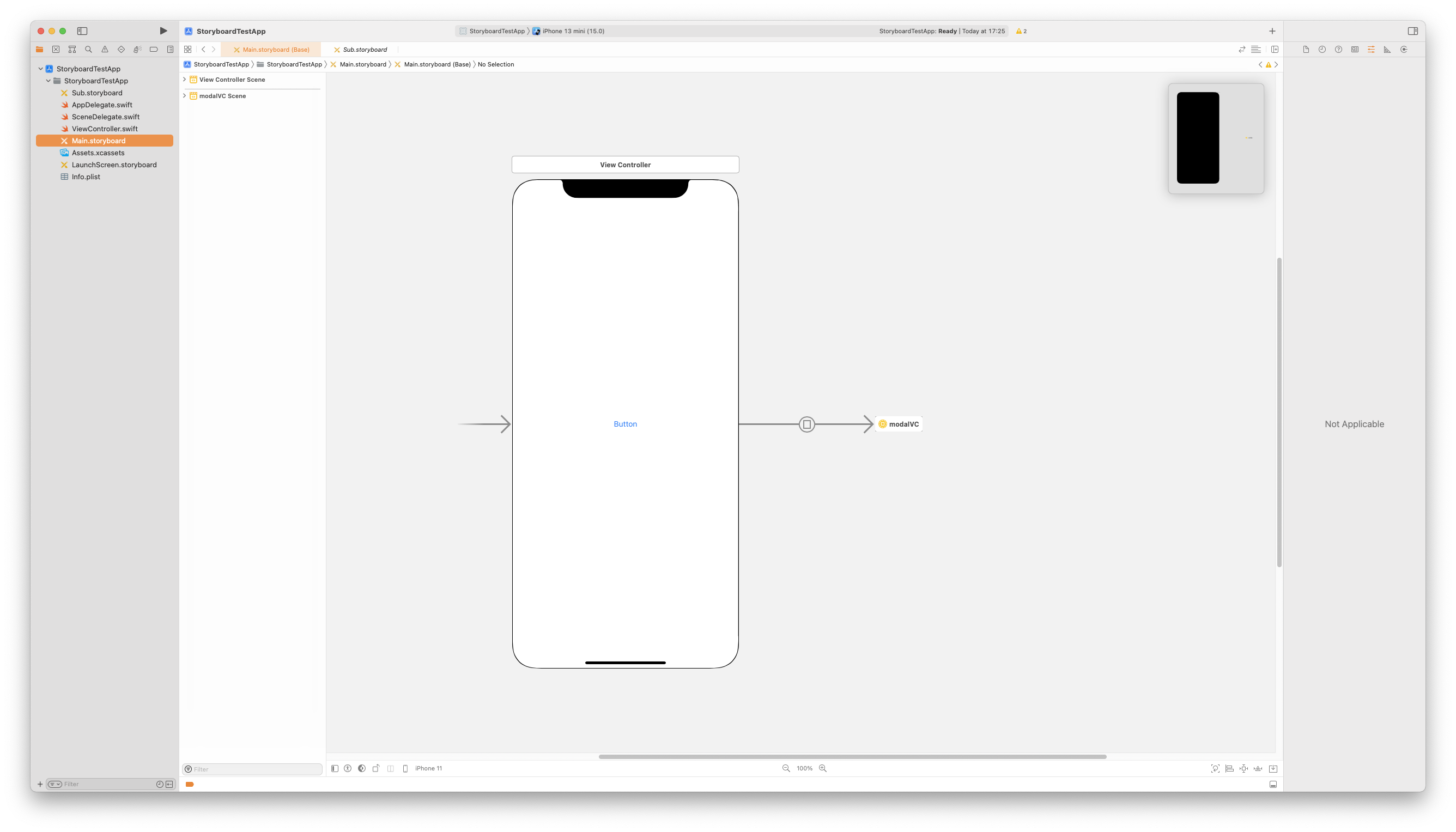이유는 Sub.storyboard 파일에는 Initial View Controller가 존재하지 않기 때문이다.