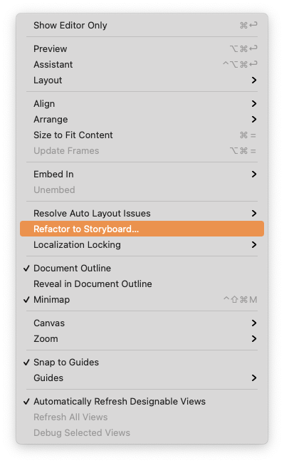 상단 메뉴에서 'Editor > Refactor to Storyboard'를 선택한다.