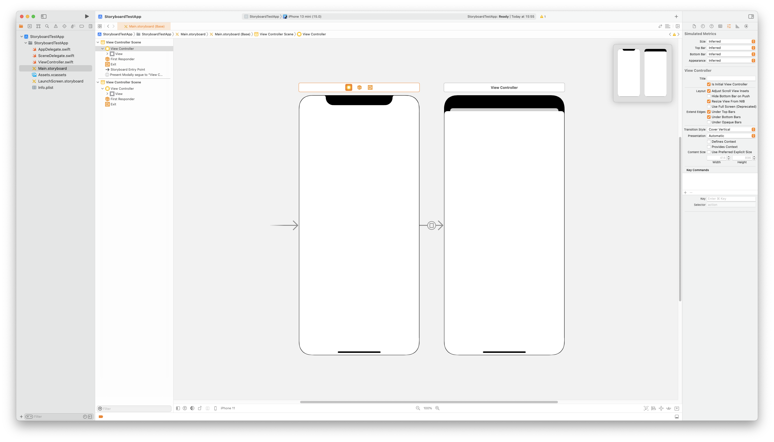 첫 번째 Scene에서 Segue를 실행하면 연결된 Scene이 자동으로 생성되고, Modal 방식으로 화면이 표시된다.