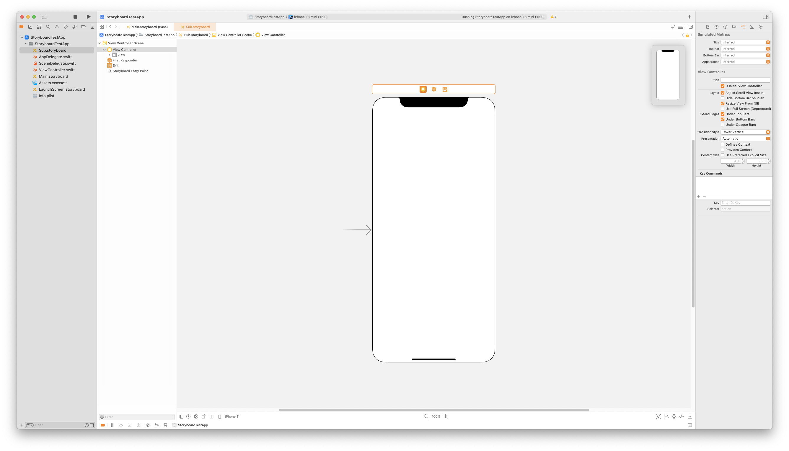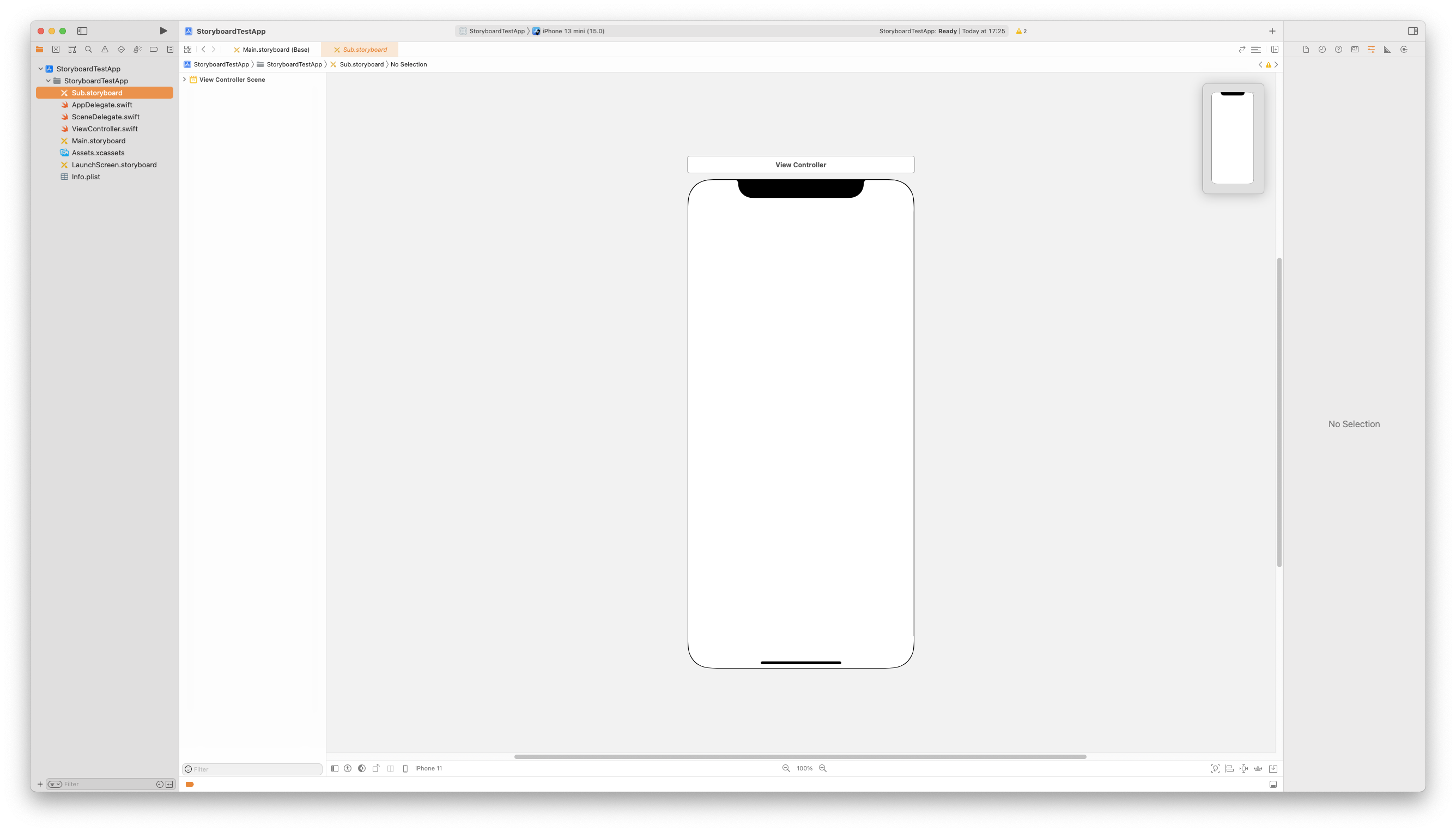 이유는 Sub.storyboard 파일에는 Initial View Controller가 존재하지 않기 때문이다.