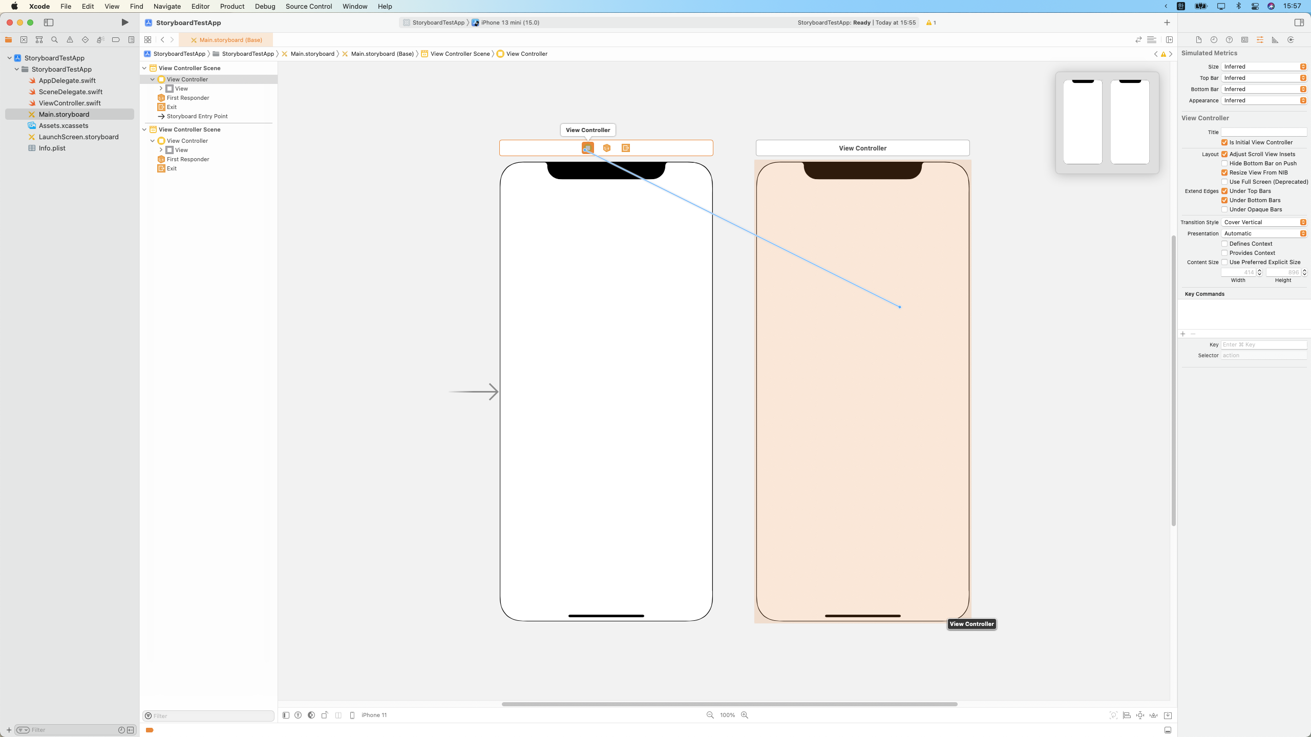 두 Scene은 이제 Segue로 연결되었다.