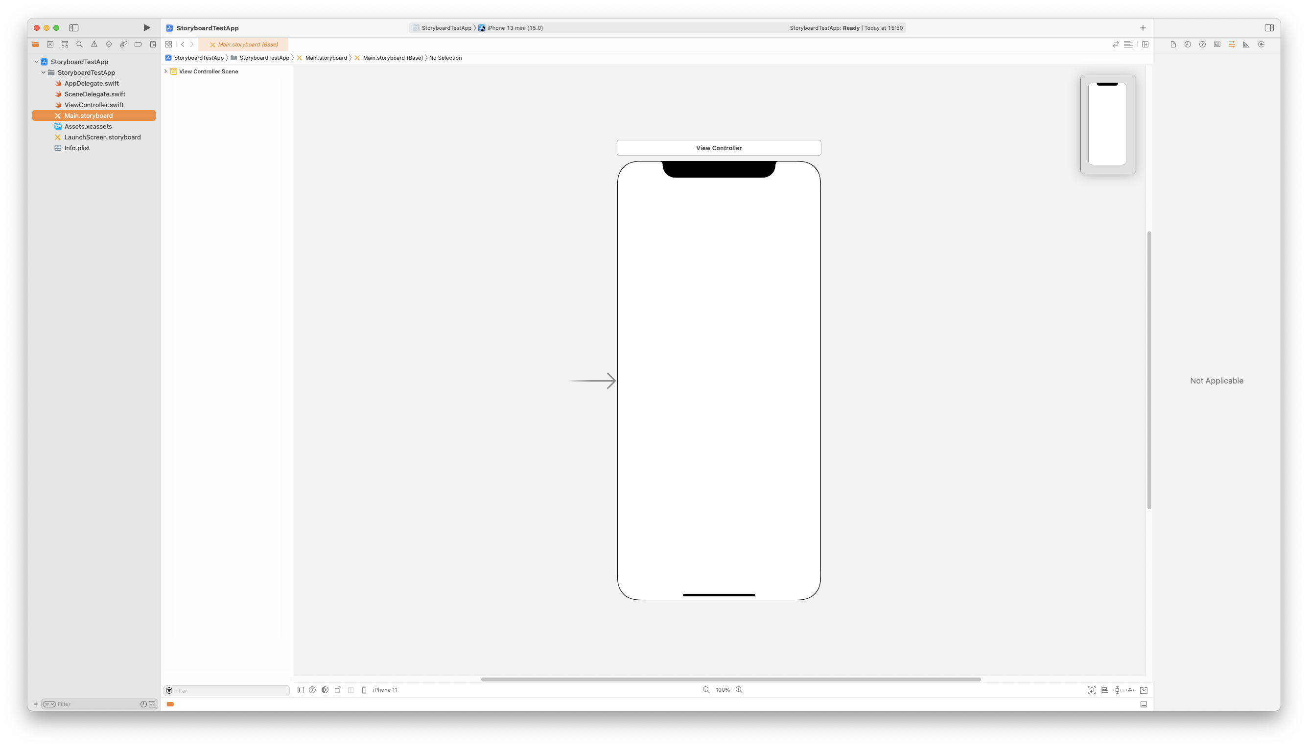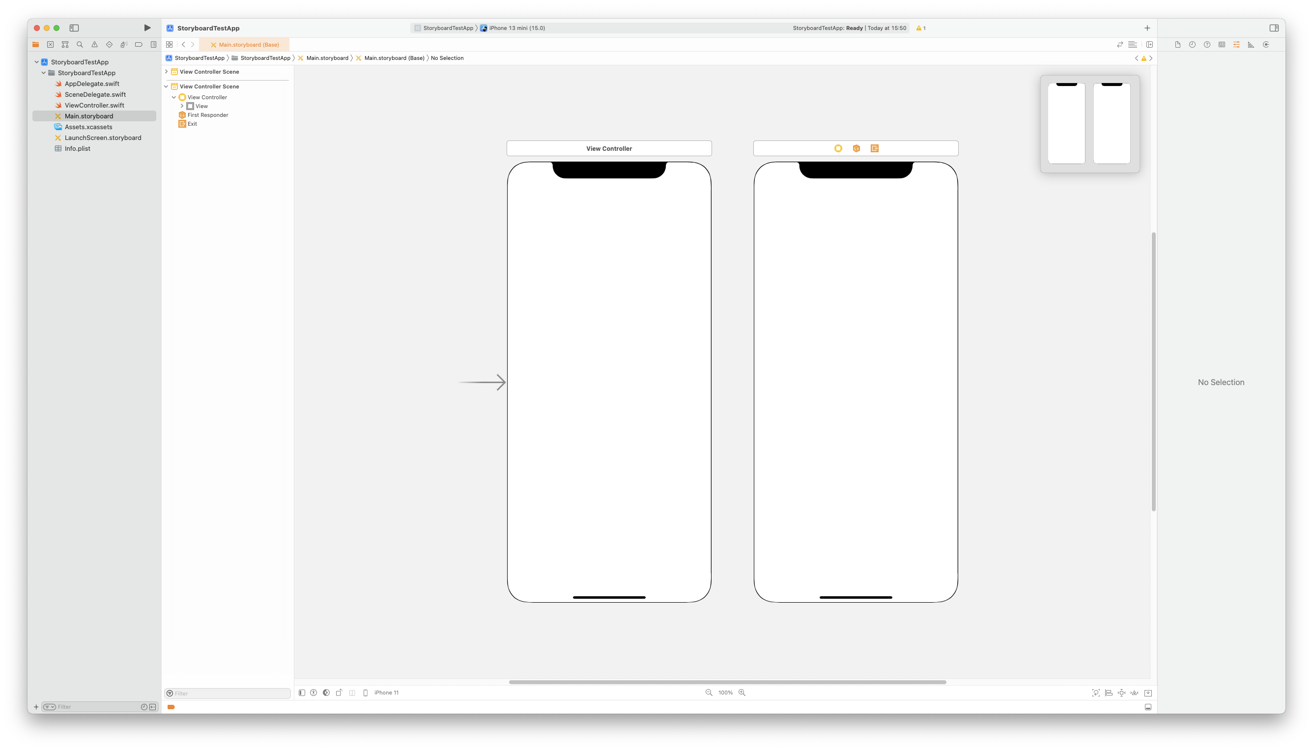 새 프로젝트를 생성하고, 왼쪽의 Document Outline을 확인하면 'Main.storyboard'가 생성된 것을 볼 수 있다.