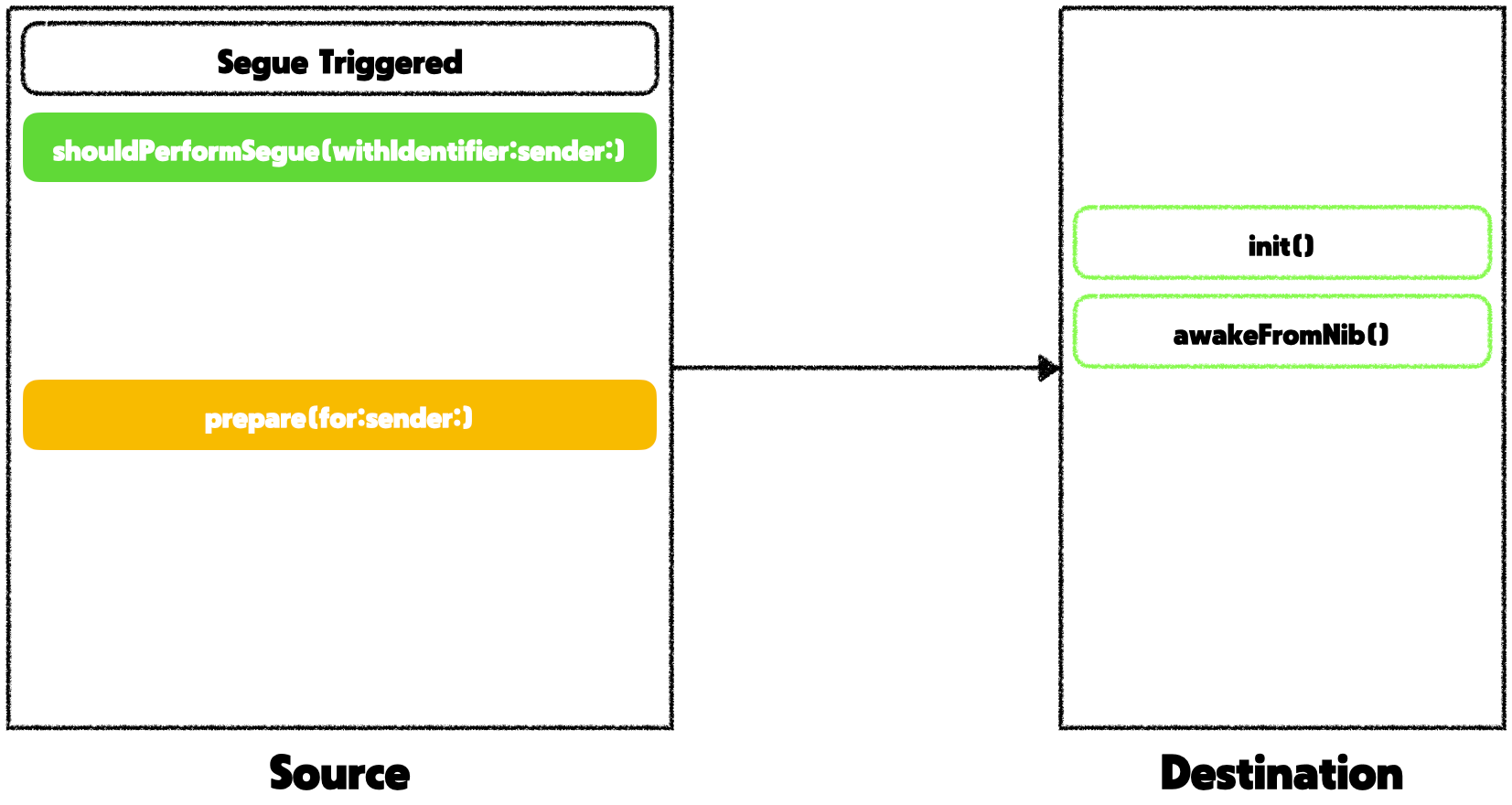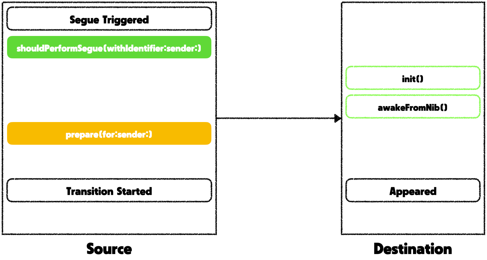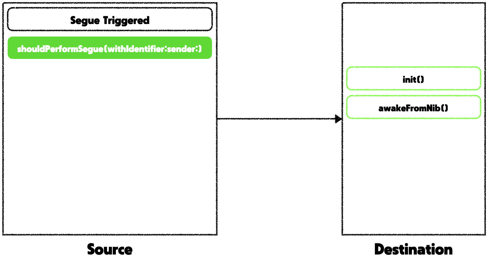 Destination View Controller에서는 생성자와 awakeFromNib 메서드를 호출한다.