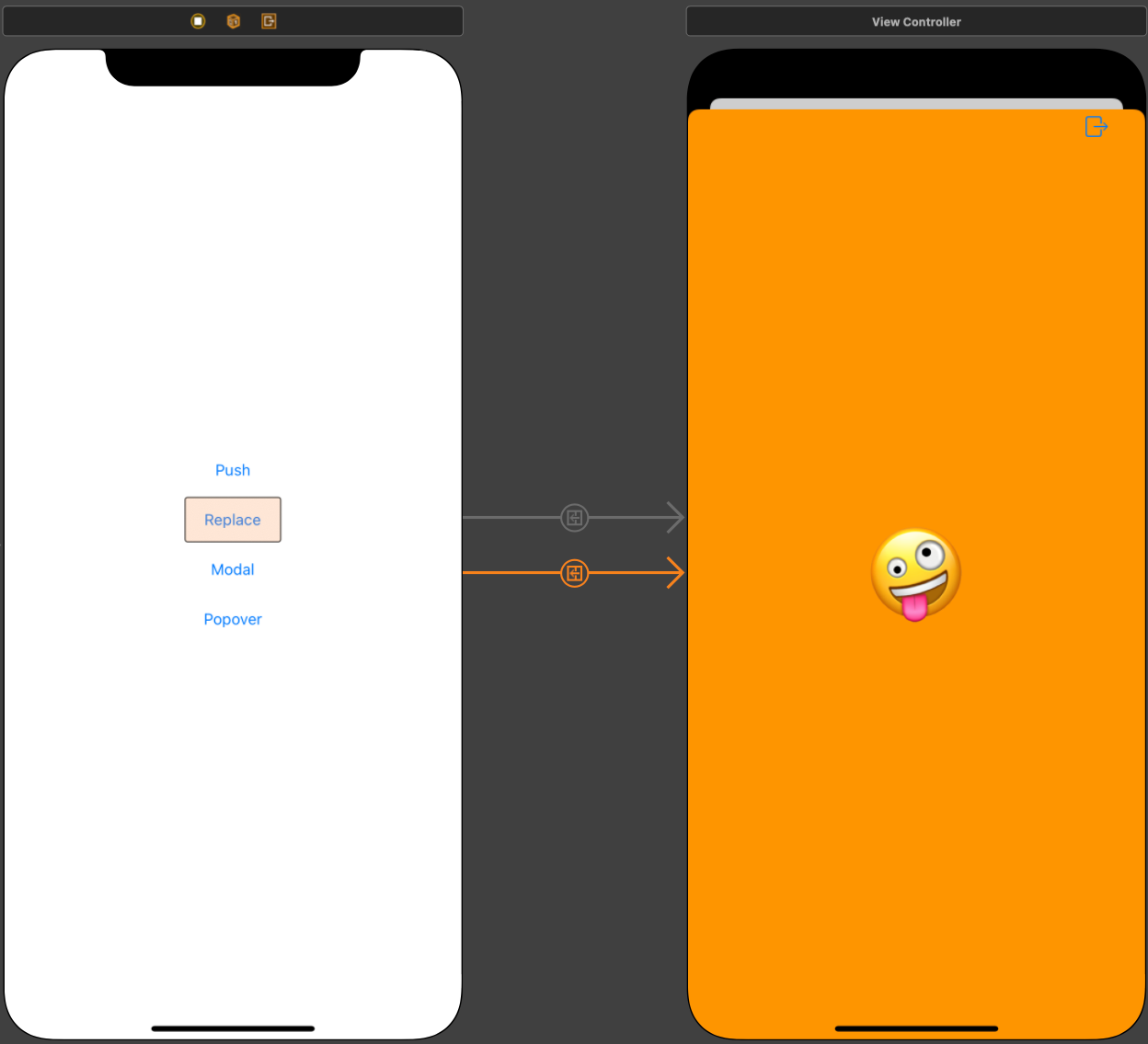 Primary View Controller의 Replace 버튼에 주목해야 한다.