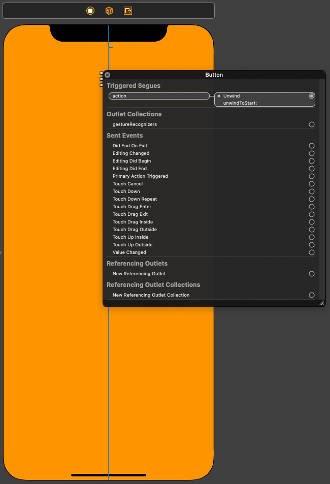 Unwind Segue는 View Controller와 연결하지 않고, Scene Dock의 Exit과 연결한다.
