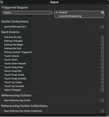 @IBAction func unwindToPresenting(_ unwindSegue: UIStoryboardSegue) {