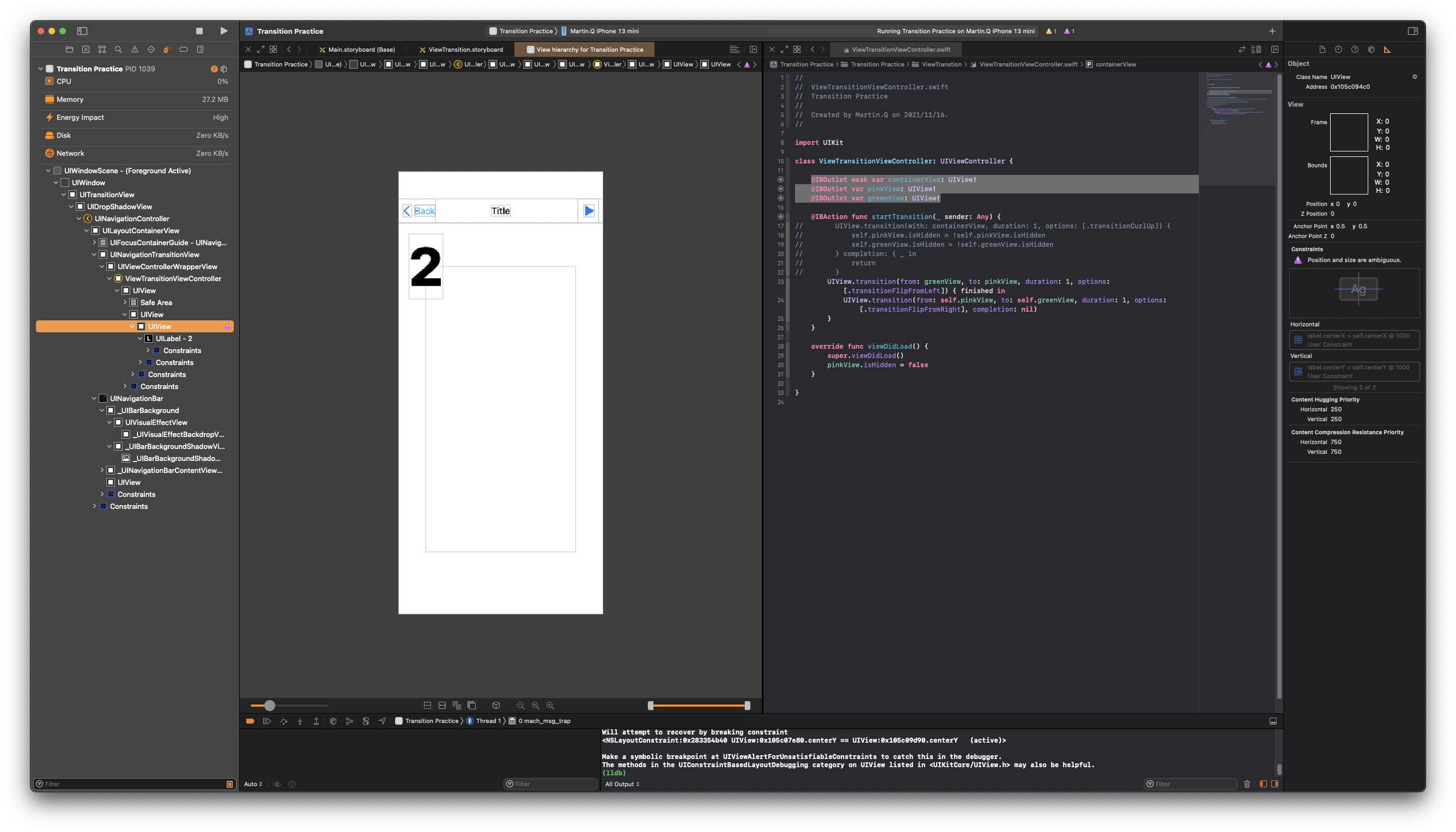 실행하면 greenView에서 pinkView로 한 번 전환이 되고 충돌이 발생하며 종료된다.