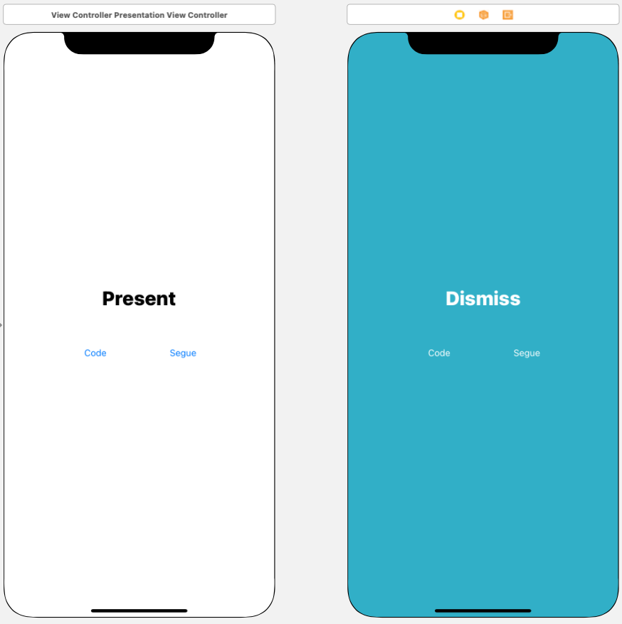 current Context 버튼은 ViewControllerPresentation storyboard의 presented Scene과 연결되어있다.