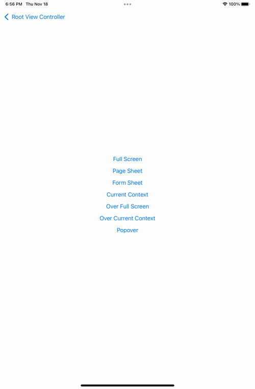 Regular인 경우 기본적으로 Full Screen 방식으로 표시되고, 홈버튼이 없는 기기의 경우 Page Sheet만 정상적으로 동작한다.