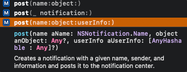 name 속성을 통해 이벤트의 종류를 지정하고, userInfo 속성에 연관된 데이터를 담아서 전달할 수 있다.