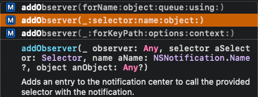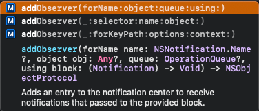 두 번째 방법으로 구현할 때는 ForName을 첫 번째 파라미터로 가지는 addObserver 메서드를 사용한다.