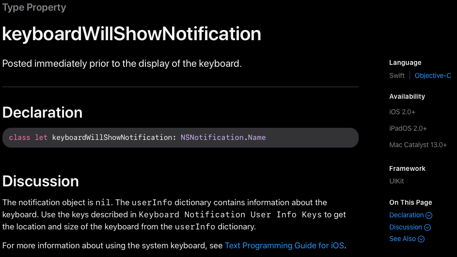 예를 들어 keyboardWillShowNotification은 키보드가 화면에 표시되기 직전에 전달된다.