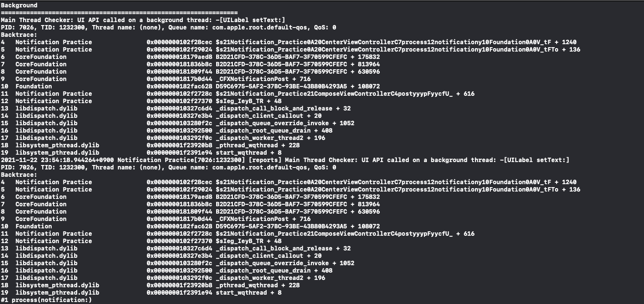 이렇게 되는 이유는 Notification을 Background Thread에서 전달했고, Observer도 동일한 코드에서 실행했기 때문이다.